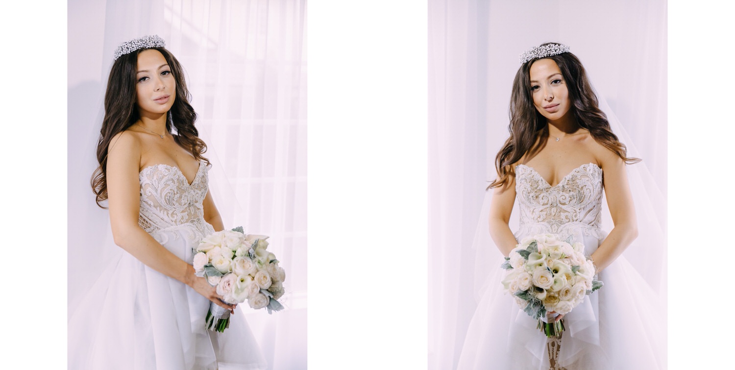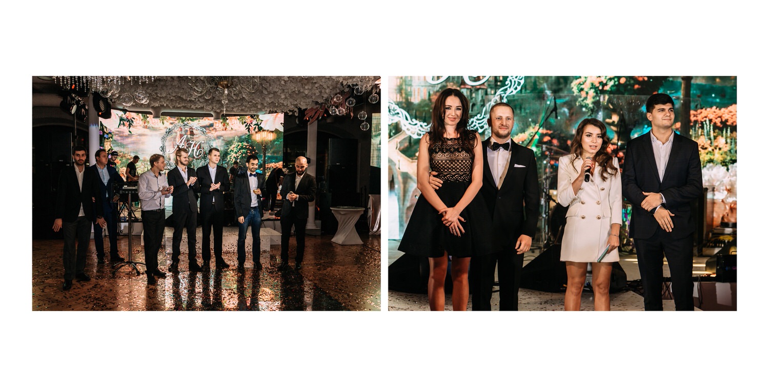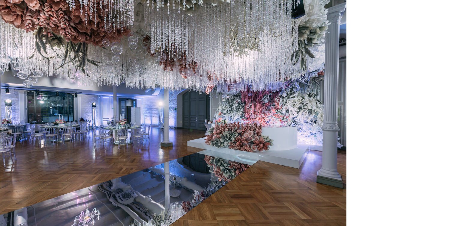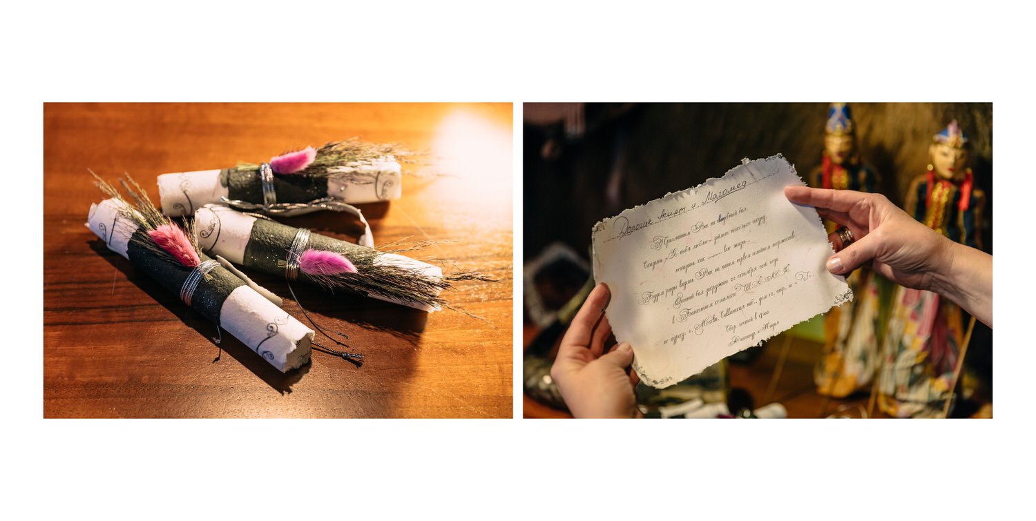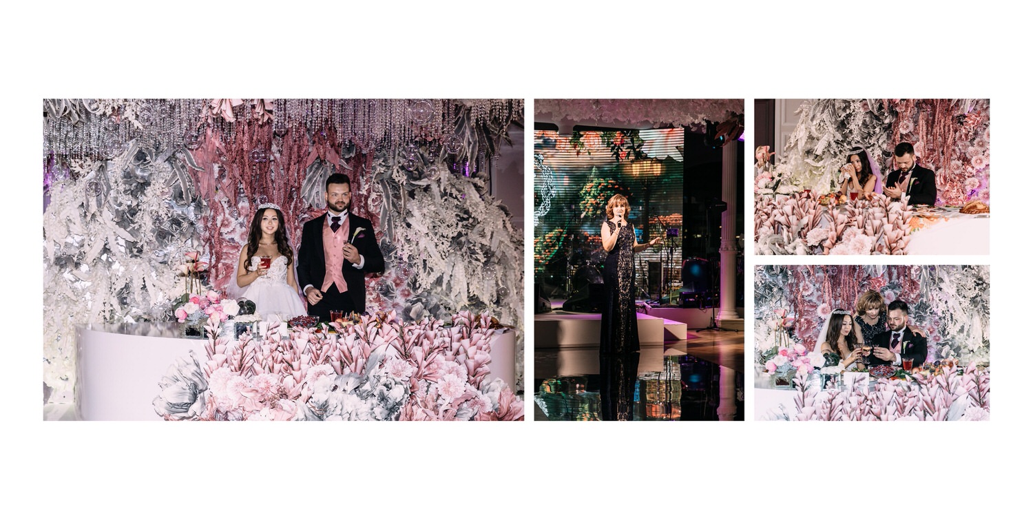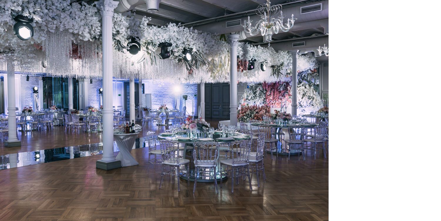 Весь день свадьбы N&A мы фотографировали перемещаясь с одной площадки на другую – погода была прохладная и дождливая. Фотосессия сборов жениха и невесты прошла в домах в район Истры. Затем мы отправились на короткую фотосессию молодоженов вдвоем в номер гостиницы St Regis Никольская. К 18-00 гости уже собрались в банкетном комплексе ШЕЛК и ожидали начало церемонии. Свадьба проходила в нескольких залах – зал для фуршета, для церемонии и для банкета на 120 гостей. Юлия Шакирова декорировала простой белый лофт зал в шикарную зимнюю сказку. Повсюду кристаллы, сказочные цветы в холодных оттенках розового и серебристо-серого. Развлекали гостей ведущие Валерий Закутский и Анна Семенович, певец Доминик Джокер, Шоу-балет Алетейя.