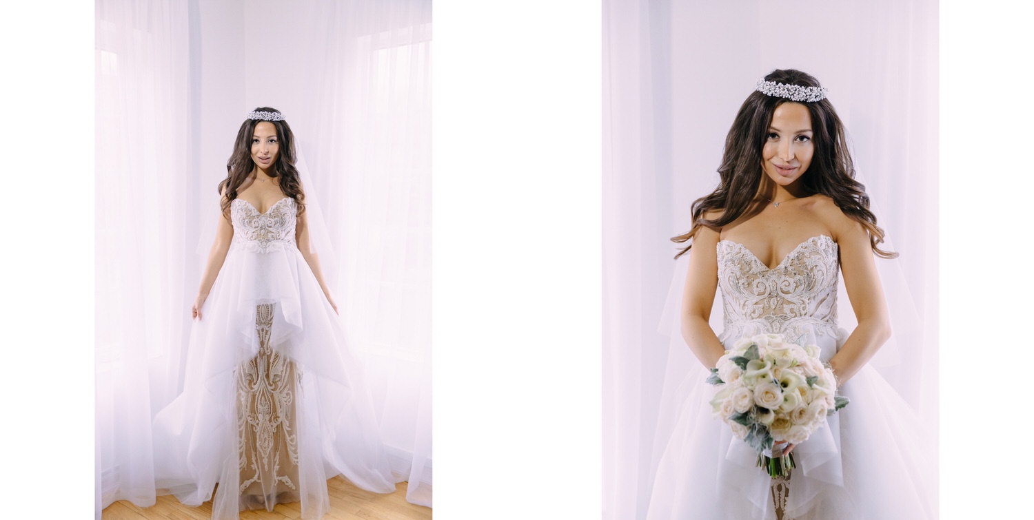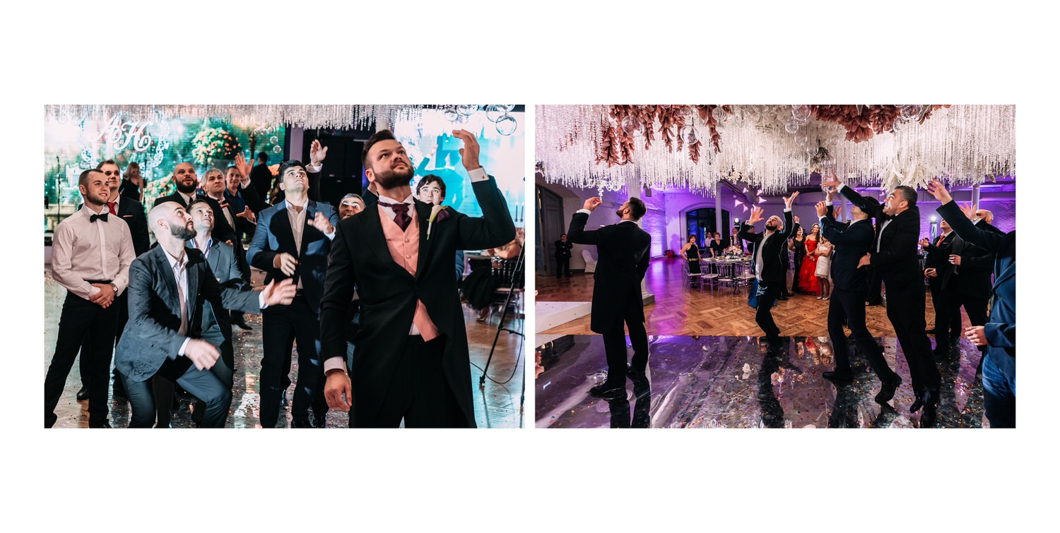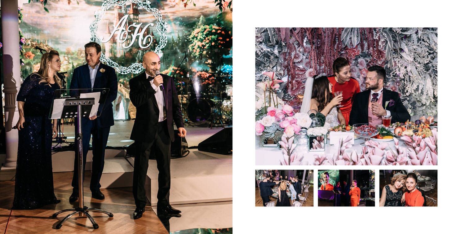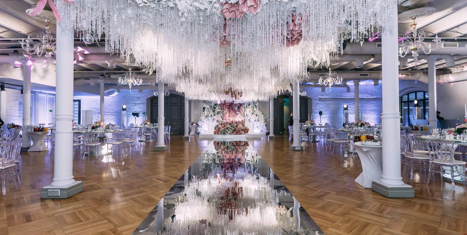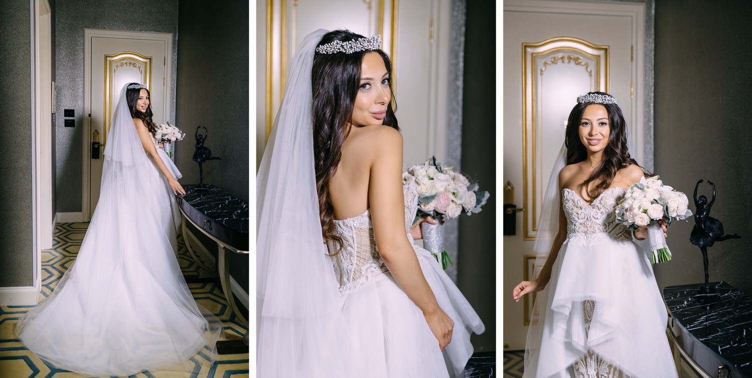 Весь день свадьбы N&A мы фотографировали перемещаясь с одной площадки на другую – погода была прохладная и дождливая. Фотосессия сборов жениха и невесты прошла в домах в район Истры. Затем мы отправились на короткую фотосессию молодоженов вдвоем в номер гостиницы St Regis Никольская. К 18-00 гости уже собрались в банкетном комплексе ШЕЛК и ожидали начало церемонии. Свадьба проходила в нескольких залах – зал для фуршета, для церемонии и для банкета на 120 гостей. Юлия Шакирова декорировала простой белый лофт зал в шикарную зимнюю сказку. Повсюду кристаллы, сказочные цветы в холодных оттенках розового и серебристо-серого. Развлекали гостей ведущие Валерий Закутский и Анна Семенович, певец Доминик Джокер, Шоу-балет Алетейя.