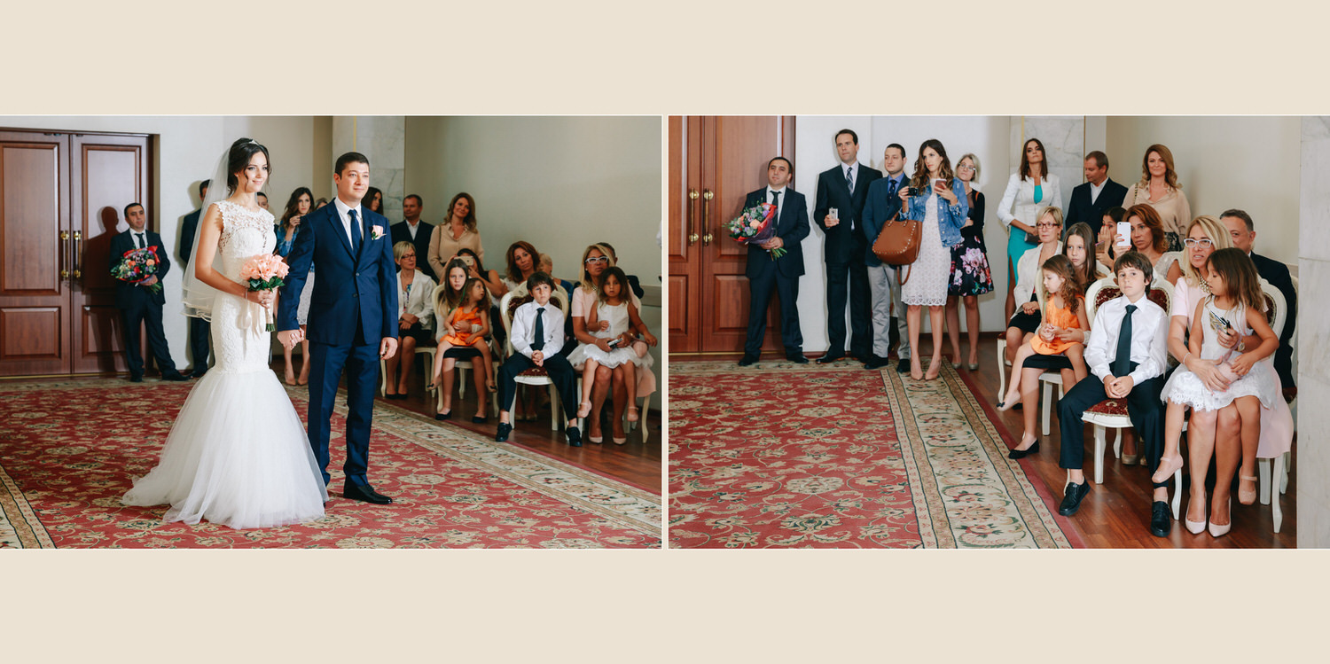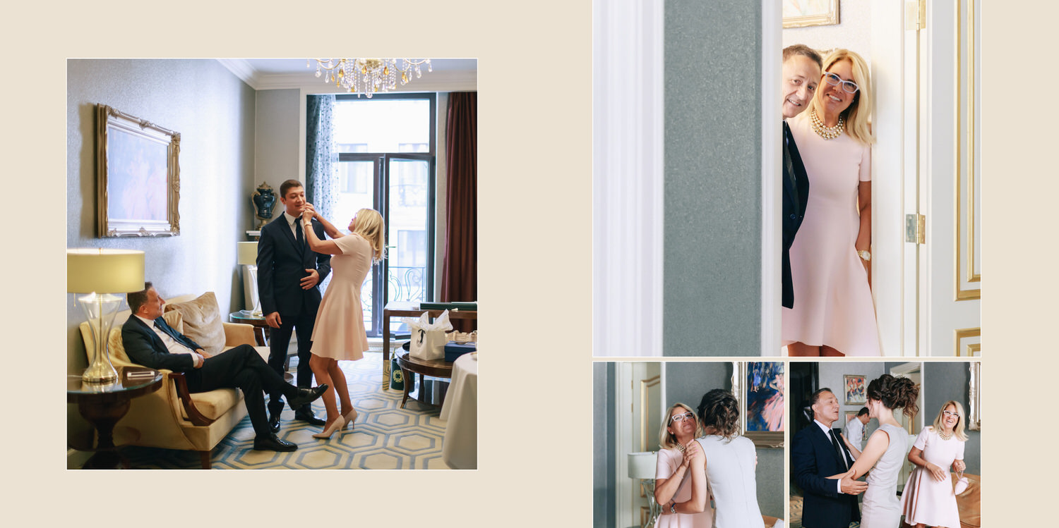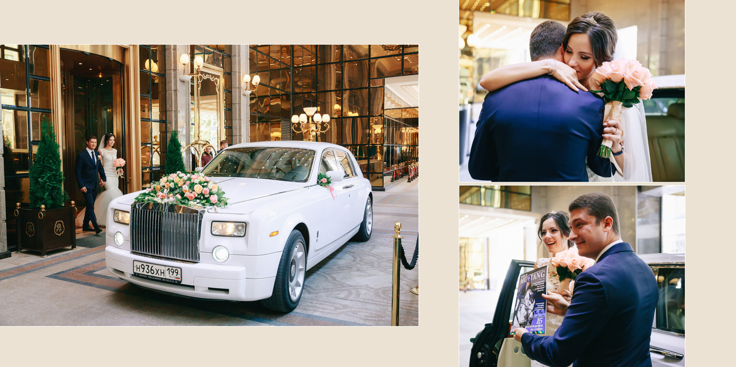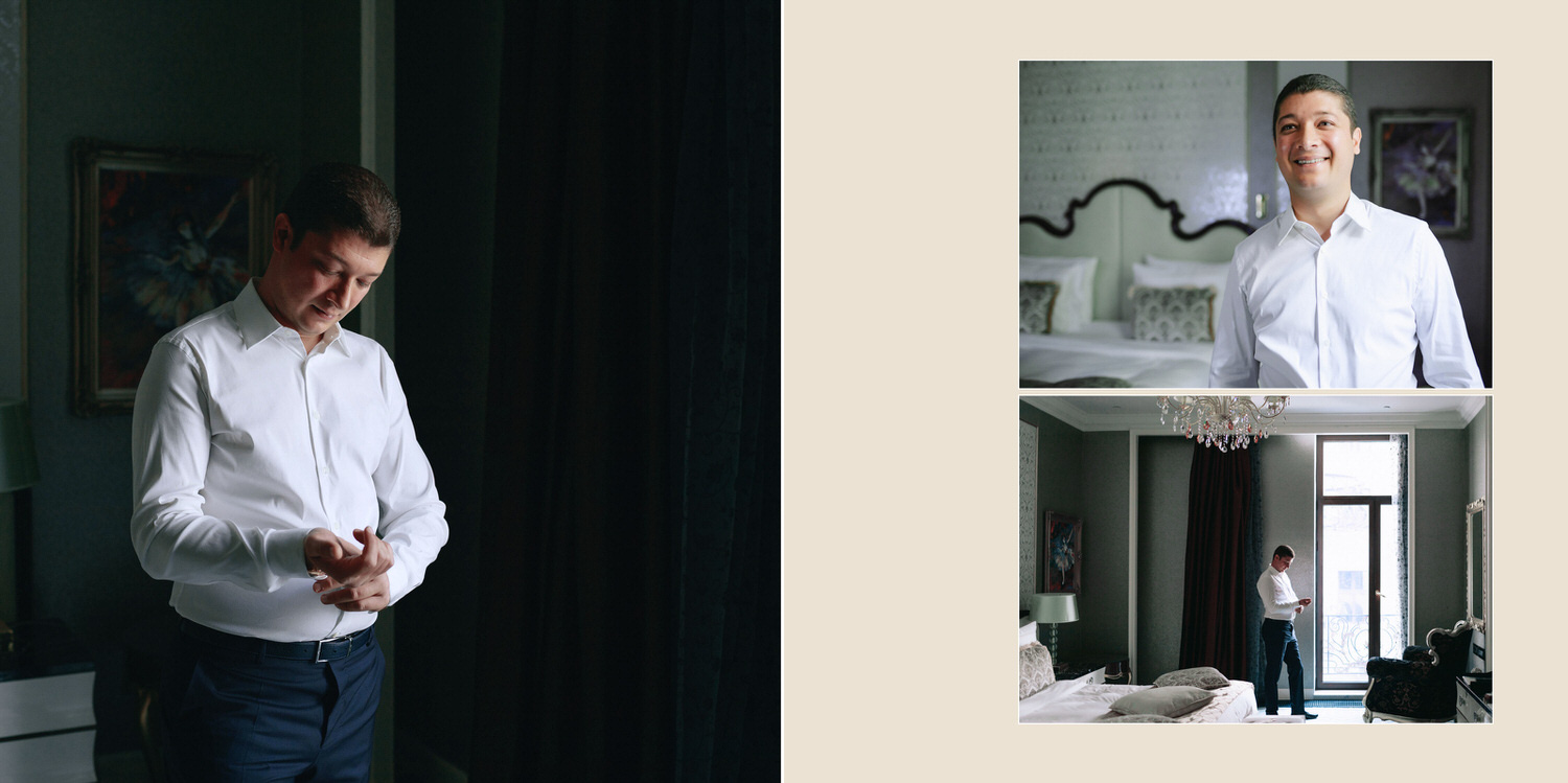 Первый день мы начали снимать в гостинице St Regis Никольская в Москве. Интерьер двухкомнатного номера для молодоженов располагал к спокойной съемке сборов невесты. Снимали мы вдвоем с оператором Сергеем Лебедевым, а также у каждого из нас было по ассистенту. Тем не менее в номере нашлось нам всем нашлось место даже когда приехали родители жениха и невесты. Фотосессию мы продолжили во внутреннем дворике гостиницы. А затем, так как жених иностранец, поехали на роспись не в ЗАГС, а в Дворец Бракосочетаний 4 на Бутырской улице. В будний день во дворце наша пара была единственной и мы смогли сделать прекрасные семейные фотографии. Отпраздновать бракосочетание отправились в ресторан Vодный на берегу Москва-реки, где на фоне шикарных яхт провели небольшую фотосессию.
