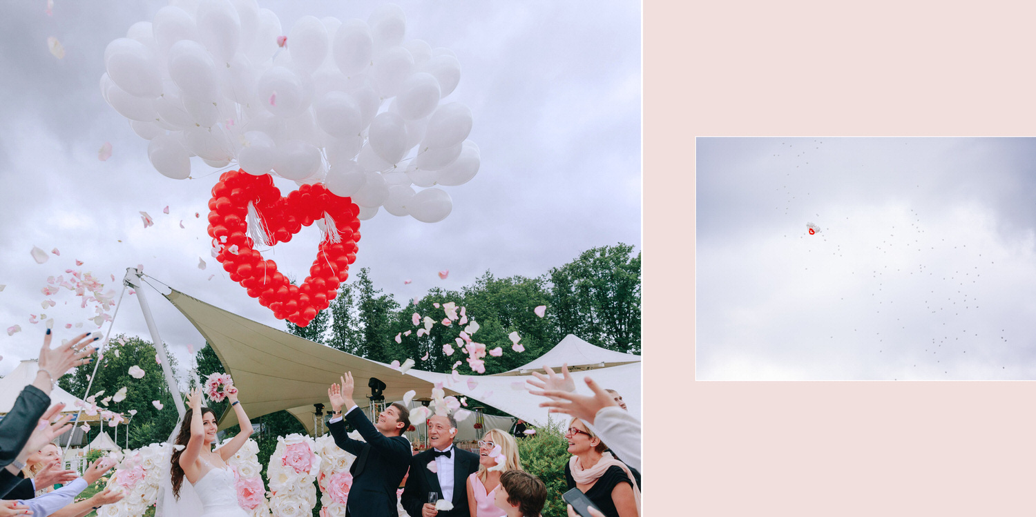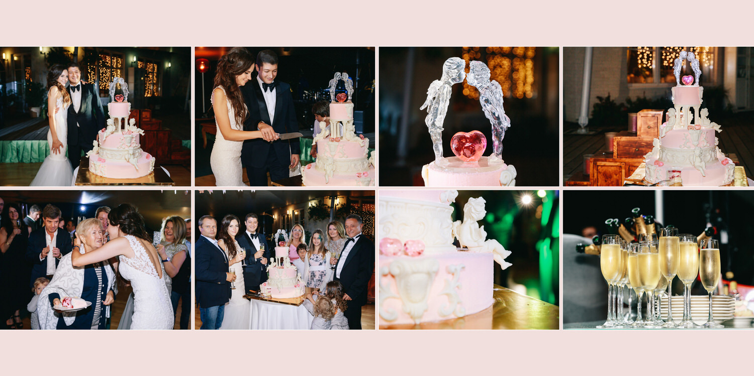 Второй день свадьбы проходил в особом для молодожен месте. Пара выбрала Конноспортивный Клуб “Отрада” так как они оба занимаются конным спортом и познакомились в клубе. Торжество проходило в шатре на свежем воздухе. Перед выездной церемонией прошла фотосессия у озера с участием свадебной кареты. А также видеоператоры успевали снимать с дрона. Свадебное платье невесты было невероятно красивым – фата и шлейф украшены сотнями бабочек. Гости много танцевали и общались, а под вечер насладились песочным шоу с историей любви А&А. В финале вынесли шикарный торт, украшенный фигурками из карамели и белого шоколада. Сказочная свадьба! Родители невесты подарили нам и всем гостям памятный сувенир – хрустальную бабочку Swarovski.